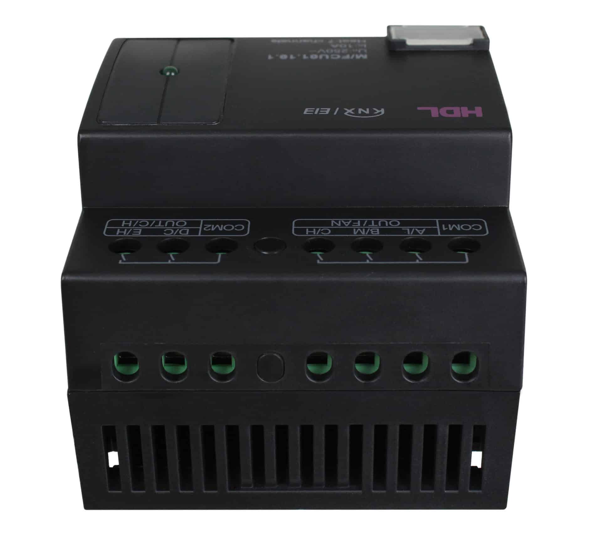 HDL KNX FCU og varmekontroller modul som kombinerer FCU kontroll og gulvvarme-kontrol i en og samme enhet. Hvis den er satt i FCU-funksjon i ETS, kan du velge mellom høy-middels-lav viftehastighet, eller kjøling/oppvarmingskontroll. I ETS har den 7 kanales gulvvarme-kontrollere og støtte for 7 digitale temperaturfølere.